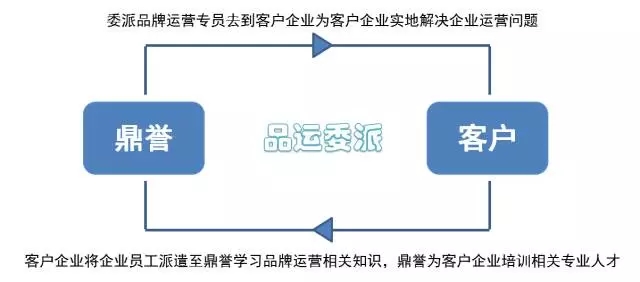 即企业向鼎誉签订品牌运营外包项目,鼎誉派遣优秀品牌运营专员驻扎企业,品牌运营专员会依据自身职业素养, 为企业提供问题诊断及人才培养,及解决问题方案等。协助企业完成互联网转型,培养互联网人才。